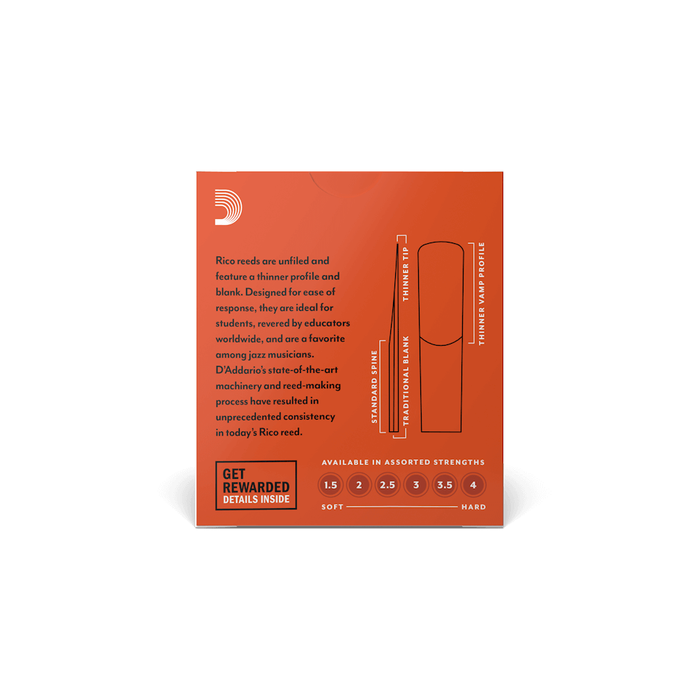 Тростини Rico by D’Addario створені спеціально для саксофоністів початківців і студентів музичних шкіл та училищ. Завдяки тонкому профілю і традиційній формі зрізу ці тростини дуже легко вібрують і прекрасно резонують, полегшуючи звуковидобування. Можливо, саме тому Rico by D’Addario дуже популярні серед джазменів і улюблені педагогами всього світу.