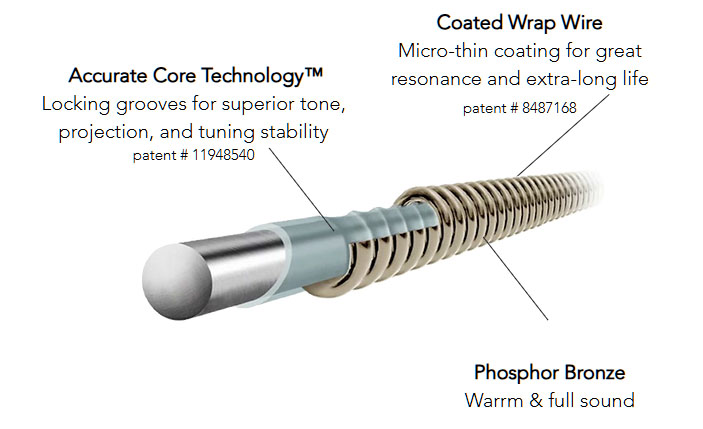 У Dragon Skin+ модернізовані як сердечник, так і обмотка, щоб вони були виключно музичними, збалансованими та гучними. Технологія Accurate Core Technology™ створює канавки на осерді, щоб утримувати обмотку, дозволяючи струнам звучати на повну силу.