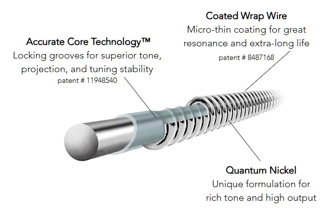 У Dragon Skin+ модернізовані як сердечник, так і обмотка, щоб вони були виключно музичними, збалансованими та гучними. Технологія Accurate Core Technology™ створює канавки на осерді, щоб утримувати обмотку, дозволяючи струнам звучати на повну силу.