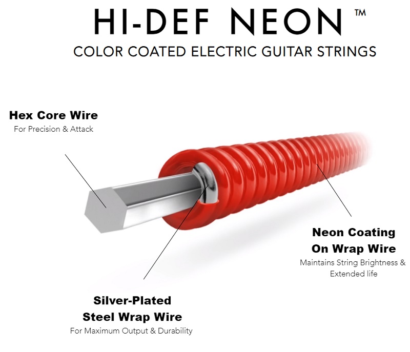 Струни для електрогітари HI-DEF NEON™ з покриттям доступні в широкому спектрі люмінесцентних кольорів,
