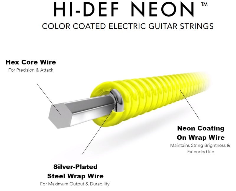 Струни для електрогітари HI-DEF NEON™ з покриттям доступні в широкому спектрі люмінесцентних кольорів,