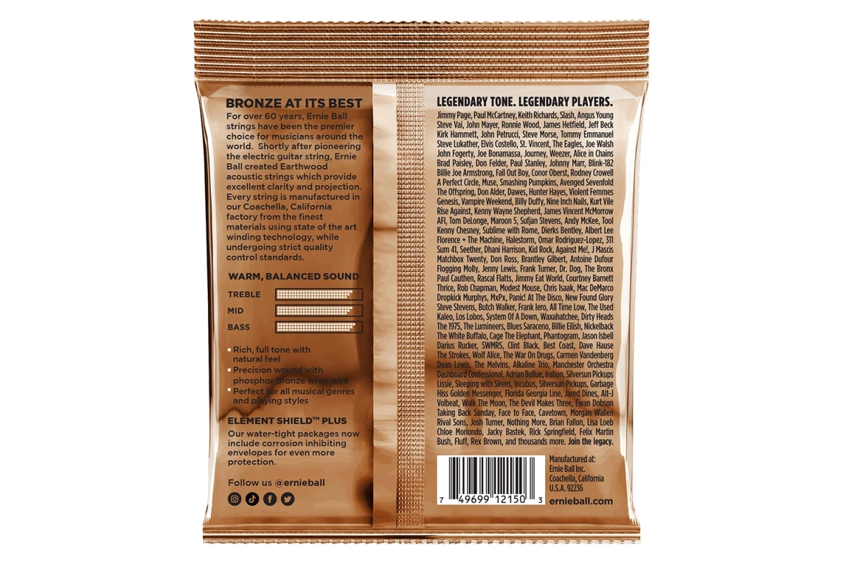 Розроблені з огляду на вимоги гітаристів по всьому світу ці концертні високоякісні струни забезпечують глибокий, багатий бас разом з чистим і яскравим звучанням нижніх струн. На струнах для акустичної гітари Ernie Ball Earthwood грають The Counting Crows, The Edge, Maroon 5, та багато інших відомих музикантів.