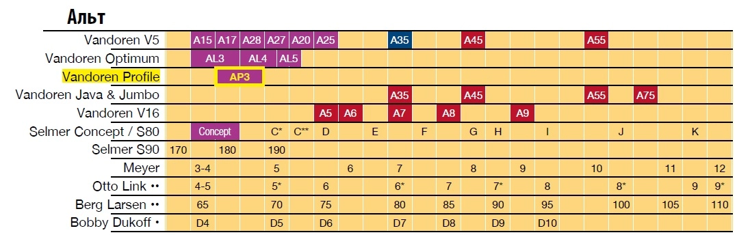 | Рекомендовані тростини Vandoren | Traditional (2.5-3); V12 (2.5-3); V21 (2.5-3); Java (2.5-3.5); Java Red Cut (2.5-3.5); Jazz (2.5-3.5); V16 (2.5-3) |