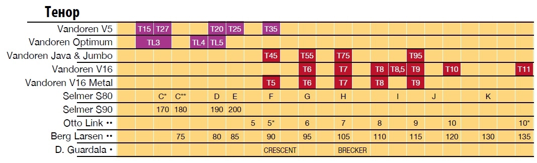 | Рекомендовані тростини Vandoren | Traditional (2.5-3); V12 (2.5); V21(2.5); Java (3-3.5); Java Red Cut (3-3.5); Jazz (3-3.5); V16 (2.5-3.5) |