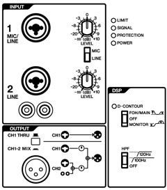 | Управління | Гучність (x2), D-CONTOUR: FOH/MAIN, MONITOR, OFF, Фільтр НЧ |
