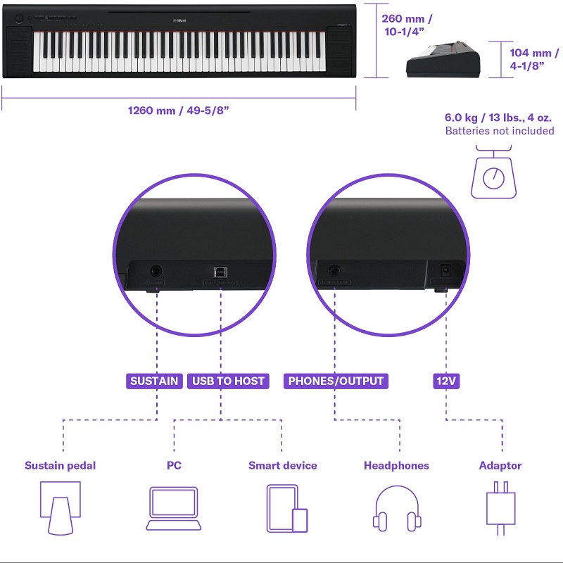 76-клавіша клавіатура (звичайне фортепіано має 88 клавіш), яка дозволяє виконувати фортепіанні твори з більшою достовірністю, не займаючи багато місця. Хоча клавіші мають ту ж коробчату форму, що і на фортепіано, клавіатура має більш легке відчуття, що полегшує початок гри піаністам-початківцям, а не більш важке відчуття стандартної клавіатури фортепіано. Ви також можете використовувати навушники з NP-35, якщо боїтеся потурбувати оточуючих своєю грою.