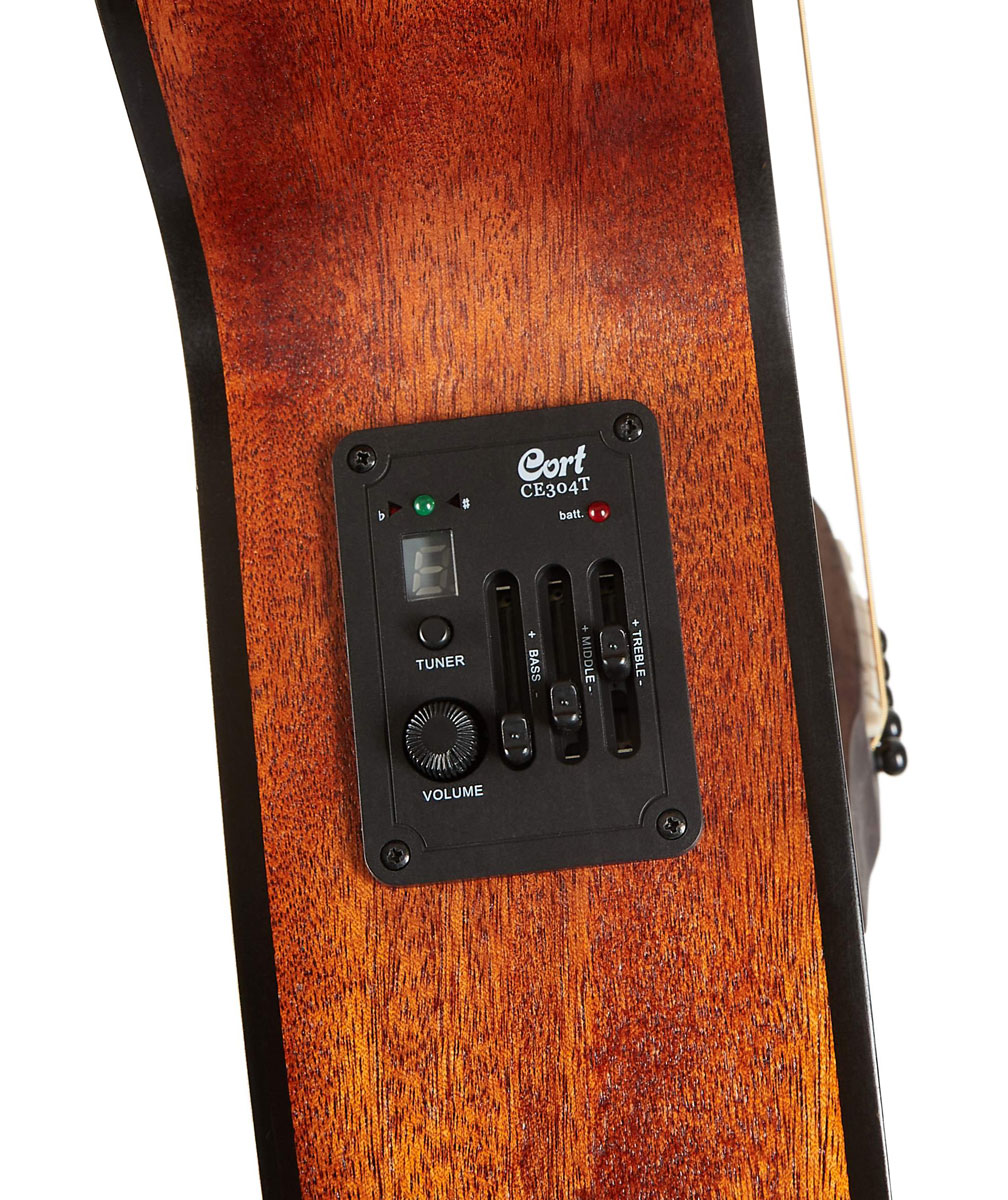 SFX-MEM оборудован встроенным керамическим пьезозвукоснимателем и предусилителем Cort CE304T. Трехполосный эквалайзер позволяет точно отрегулировать звучание инструмента, а хроматический тюнер с LED дисплеем дает возможность быстро и удобно настроить гитару даже на самой темной сцене.