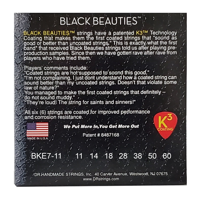 Вони мають обмотку з нікельованої сталі на шестигранному сердечнику для збереження яскравості та відчуттів. Усі струни в наборі мають чорну версію надтвердого покриття DR K3™. Музиканти кажуть, що ці струни мають більш тривалий термін служби, велику проекцію, більшу ясність, кращу артикуляцію і менше небажаних обертонів, ніж струни без покриття.