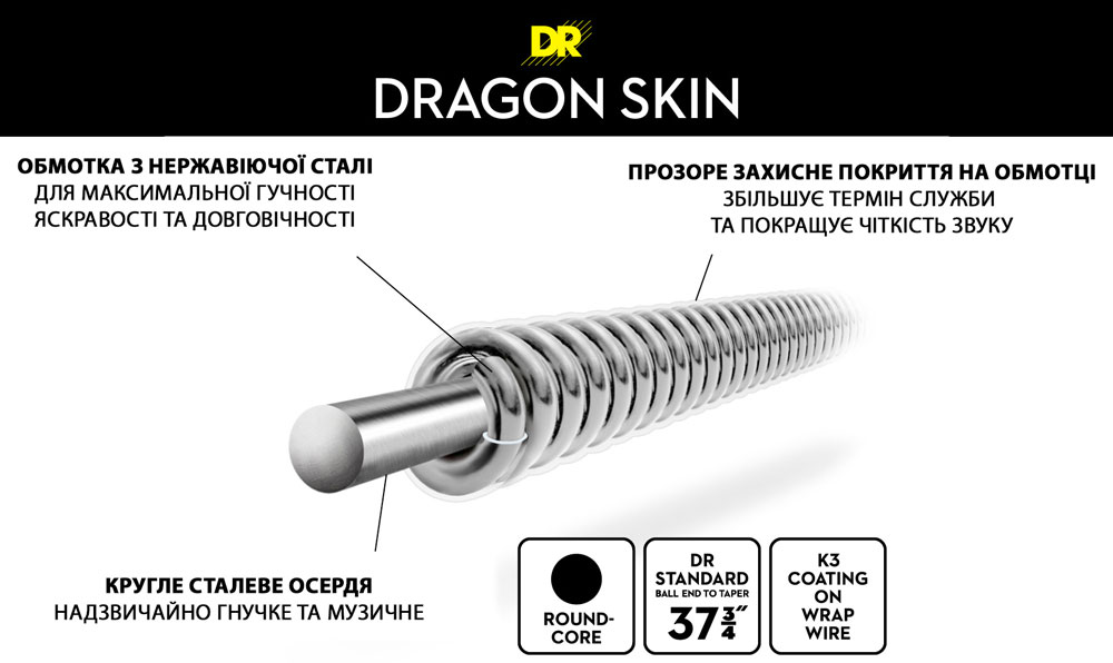Басовые струны серии Dragon Skin™ получили фирменное прозрачное покрытие DR K3™ на обмотке из нержавеющей стали, предотвращающее попадание грязи и пота на круглый стальной сердечник для надежной защиты от коррозии. Запатентованное покрытие K3™, нанесенное на все струны в наборе, является сверхтвердым и не гасит вибрацию, как это делают более мягкие защитные покрытия. Струны Dragon Skin звучат очень чисто и сфокусированно, имеют меньше нежелательных обертонов и невероятную артикуляцию в сравнении с обычными струнами без покрытия.