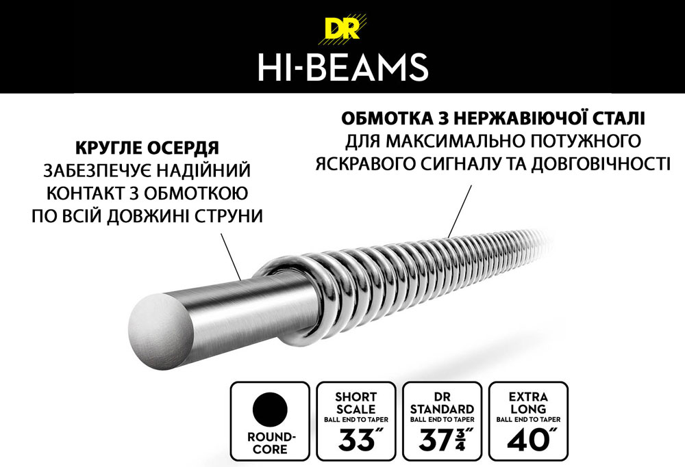 Басовые струны Hi-Beam из нержавеющей стали имеют круглую обмотку и круглый стальной сердечник, что делает их уникальными. Для изготовления струн Hi-Beam требуется гораздо больше времени, внимания и дополнительных действий, чем для других басовых струн. Дополнительные усилия, затрачиваемые DR на создание Hi-Beam, позволили получить очень гибкие басовые струны с очень музыкальным, ярким, но не резким звучанием. Они известны своей прочностью, необычайно долгим сроком службы, стабильностью и балансом между струнами. Они не едят ваши лады. HI-BEAM — это струны, которые музыканты выбирают за яркость, мощь и легкость игры..