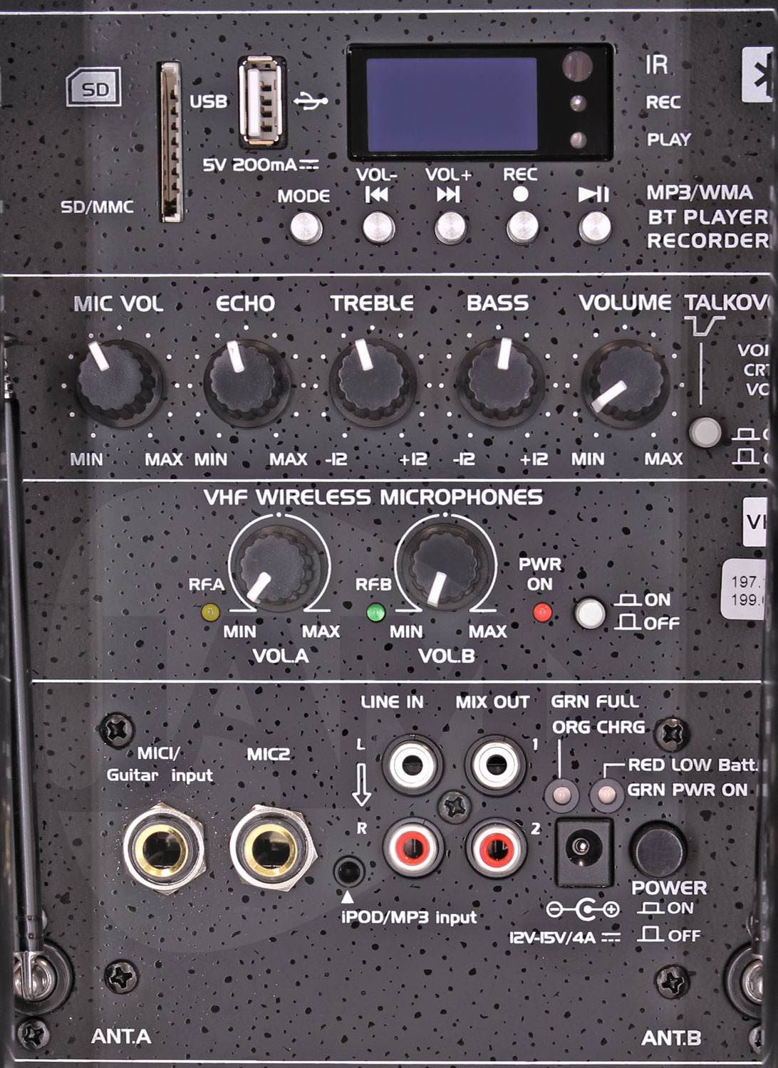 Система оснащена встроенным медиаплеером USB/SD, Bluetooth для беспроводной передачи аудио и комплектом из двух ручных VHF-радиомикрофонов. Это позволяет быстро организовать озвучивание без дополнительного оборудования: музыка, голос, объявления и фонограммы воспроизводятся удобным способом в любом сценарии использования. В реальной работе это дает гибкость и экономию времени — можно оперативно переключаться между источниками сигнала и проводить мероприятие без лишней коммутации.