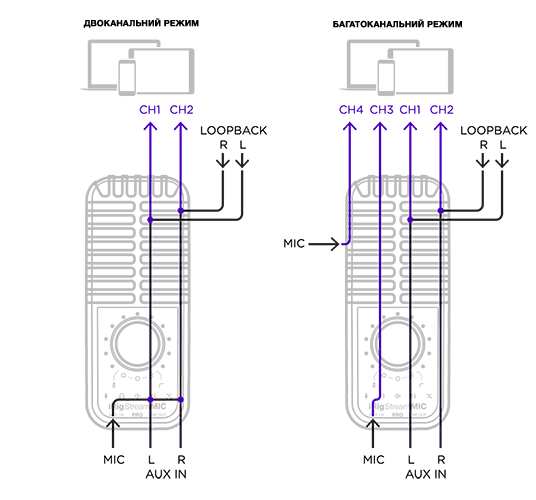 iRig Stream Mic Pro предлагает 2 режима: стерео или многоканальный. По умолчанию он работает в стереорежиме и предварительно микширует несколько источников звука (линейные стереовходы, Loopback и микрофонные капсюли) в стереодорожку, которая отправляется в выбранное приложение для трансляции, такие как Instagram, Facebook, Twitch, и т. д.