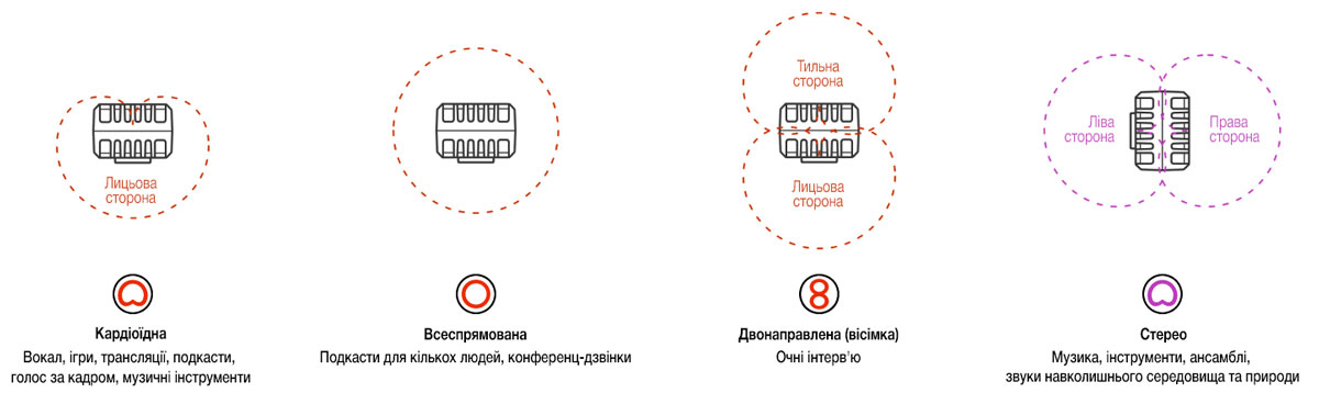 | Характеристика направленности | Кардиоидная, всенаправленная, восьмерка и стерео |