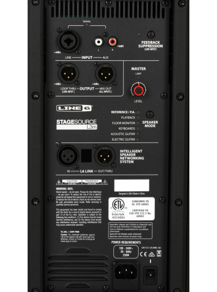 Управление на задней панели2 x XLR / 1/4" TRS, 2 x RCA, L6 Link XLR In/Out, Loop Thru XLR, Mix Out XLR, Feedback Suppression (On/Off/Mode), Master Level, Smart Speaker