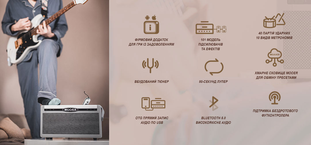 Ключевым преимуществом в линейке усилителей MOOER является мобильное приложение iAMP, которое добавляет возможность взаимодействовать с тембрами, хранящимися в облаке, обновлять прошивку и редактировать любые цепочки тонов/эффектов по своему вкусу. SD30i поддерживает беспроводной протокол Bluetooth 5.0 для прослушивания музыки, репетиций или записи с фонограммой.