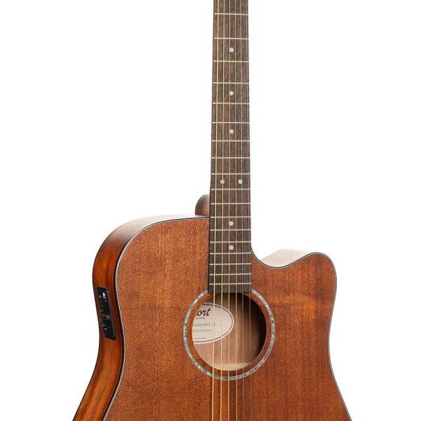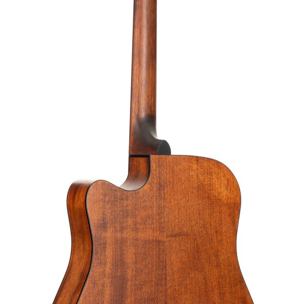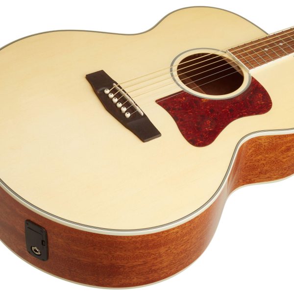 В неподключенном режиме гитара сохраняет читаемую середину и достаточный запас громкости для репетиций. При подключении к усилителю или пульту модель передает акустический характер без резких провалов в спектре, что полезно для живых сетов и домашней записи. Встроенный блок подзвучки/электроники: Fishman GT1.